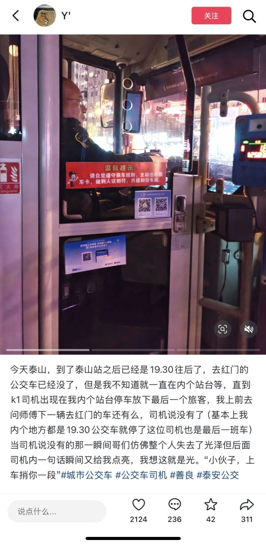 事后,這位來泰山旅游的外地游客通過個人抖音發(fā)布了對律發(fā)彬師傅的稱贊,滿含感激之情,引發(fā)眾多網(wǎng)友關注點贊。律發(fā)彬師傅的善舉,生動詮釋了泰安公交“想乘客所想,急乘客所急” 的服務理念。一直以來,泰安公交始終踐行“全心全意為人民服務”的宗旨,今后將持續(xù)為泰城市民和來泰山旅游的游客,提供更加優(yōu)質(zhì)、貼心的公交出行服務,讓每一位踏上泰安土地的人,都能真切感受到這座城市的溫暖與善意。
