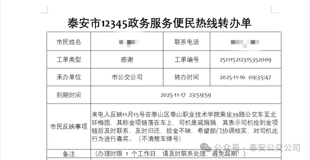 2025年11月16日,泰安市民趙女士通過(guò)泰安市12345政務(wù)服務(wù)熱線,向39路公交車(chē)駕駛員戚娟娟致以誠(chéng)摯感謝,為其拾金不昧的暖心舉動(dòng)點(diǎn)贊。