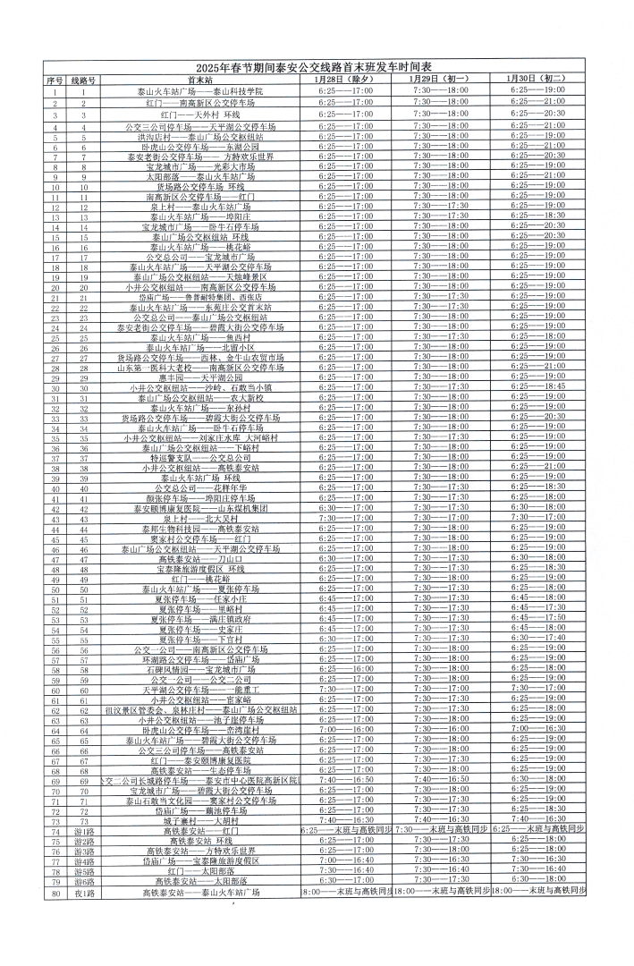 為切實保障好春節(jié)期間市民出行,泰安市公共交通有限公司結合市民節(jié)日出行規(guī)律和變化,統(tǒng)籌考慮安排公交線路首末班發(fā)車時間,1月28日、29日(除夕、初一)將對所屬營運線路發(fā)車間隔、首末班時間等作出調(diào)整(具體情況見附表)。
